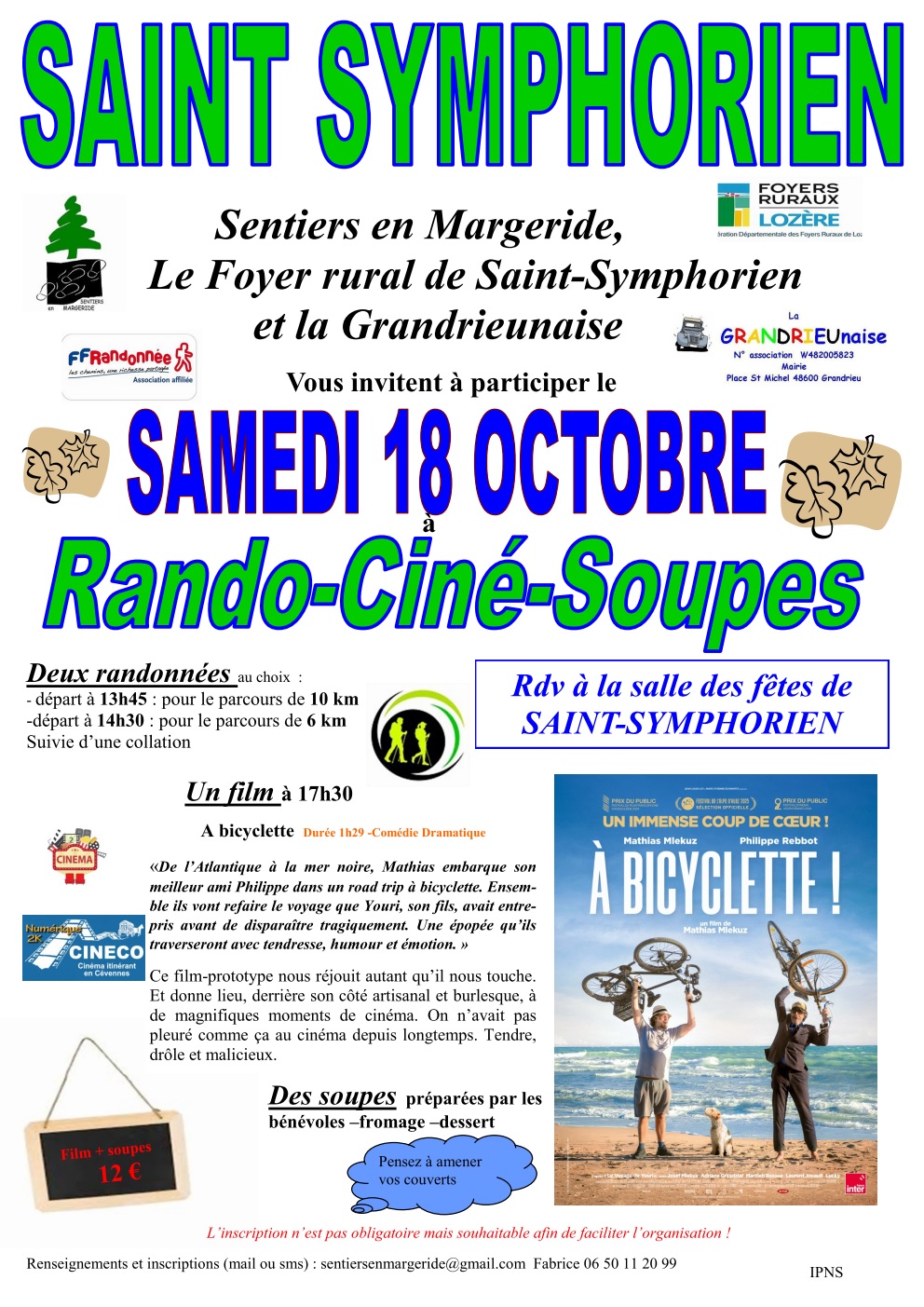 Le Foyer Rural de St Symphorien, Sentiers en Margeride et la Grandrieunaise vous invitent à participer à la journée Rando-Ciné-Soupes, au programme :