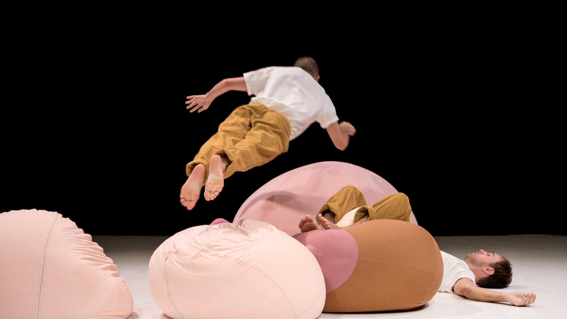 Plonger tête la première dans d’énormes coussins en forme de seins. Les assembler, tours aux courbes arrondies ou petits cailloux sur le chemin, pour créer un arc-en-ciel de couleurs de peaux. Regarder, toucher, danser, caresser…