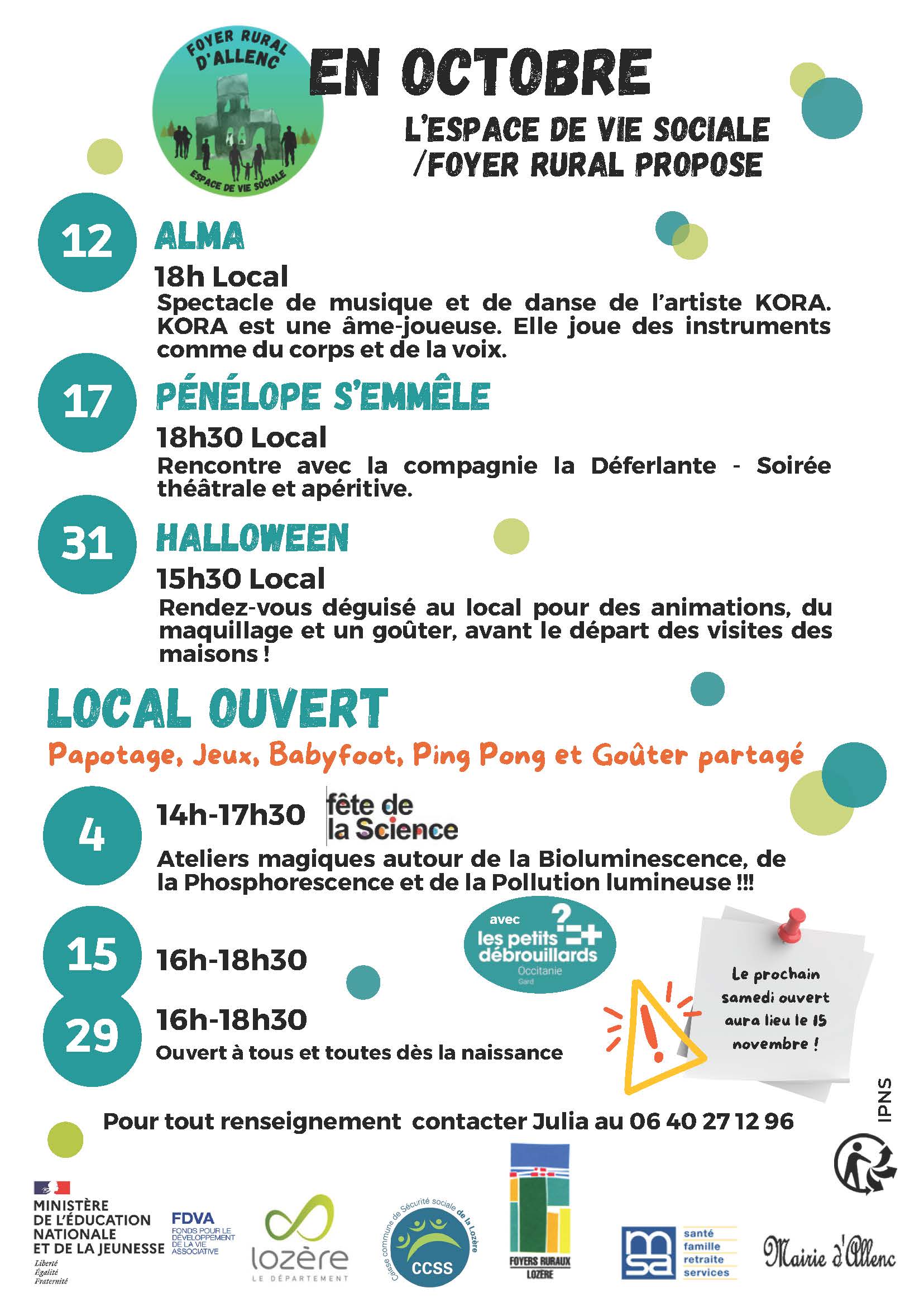 À l'afficheLe 08/10/2025 à 15h00Médiathèque de Marvejols - 48100 MARVEJOLSLe 09/10/2025 à 15h00Scénovision - 48120 SAINT-ALBAN-SUR-LIMAGNOLELe 09/10/2025 à 20h309 Rue Célestin Freinet - FLORAC - 48400 FLORAC TROIS RIVIERESLe 11/10/2025 à 20h00Salle du conseil de la mairie - FLORAC - 48400 FLORAC TROIS RIVIERES