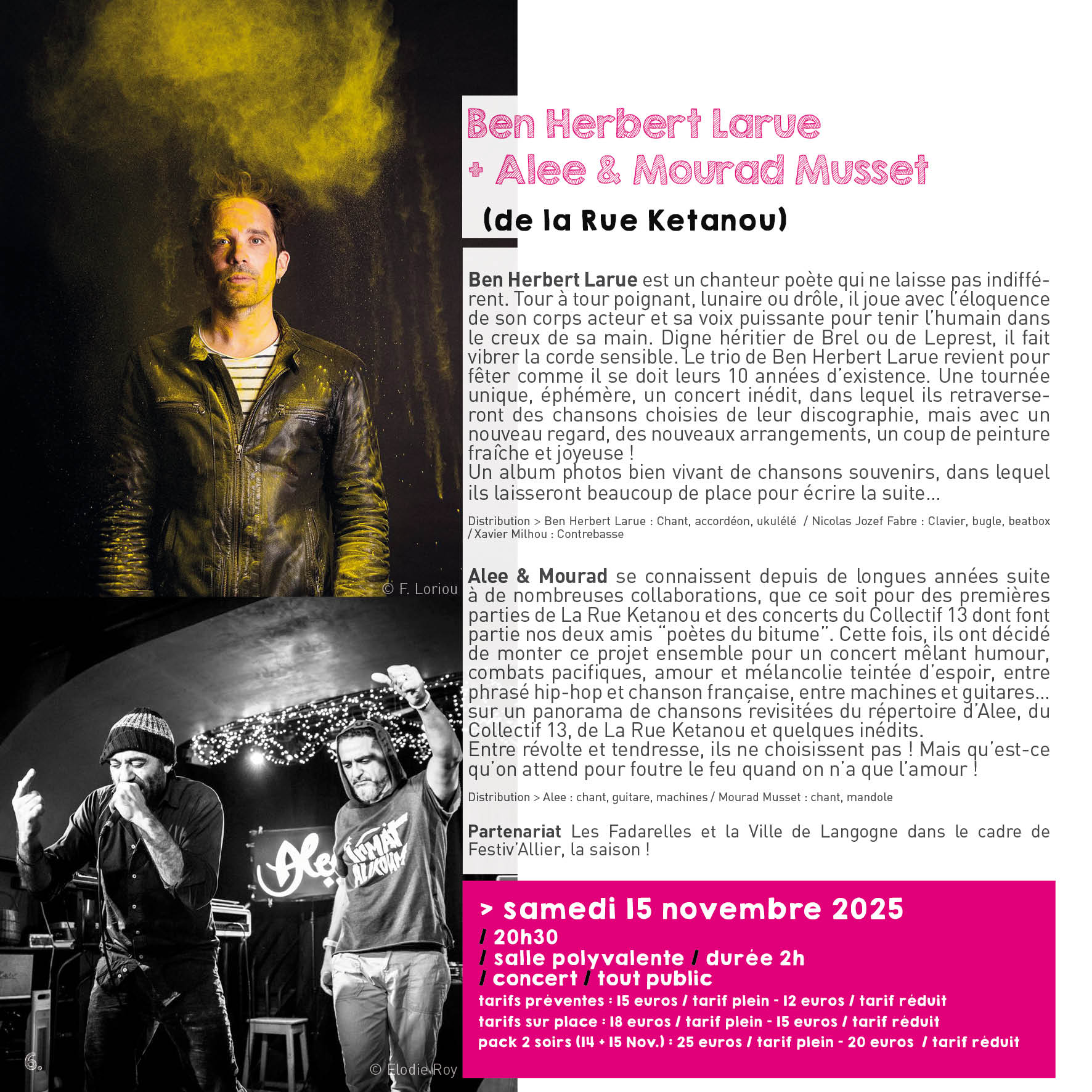 Cette fois, ils ont décidé de monter ce projet ensemble pour un concert mêlant humour, combats pacifiques, amour et mélancolie teintée d’espoir, entre phrasé hip-hop et chanson française, entre machines et guitares… sur un panorama de chansons revisitées du répertoire d’Alee, du Collectif 13, de La Rue Ketanou et quelques inédits. Entre révolte et tendresse, ils ne choisissent pas ! Mais qu’est-ce qu’on attend pour foutre le feu quand on n’a que l’amour !