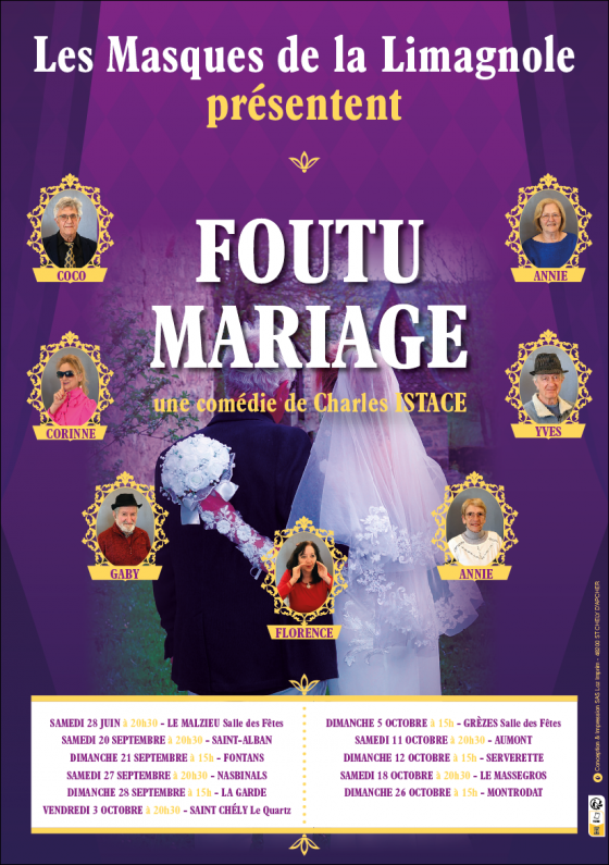 La troupe Les Masques de la Limagnole vous donne rendez-vous à la Salle des Fêtes du Massegros le Samedi 18 octobre à 20h30 pour une soirée placée sous le signe de l’humour avec la comédie Foutu Mariage, écrite par Charles Istace.