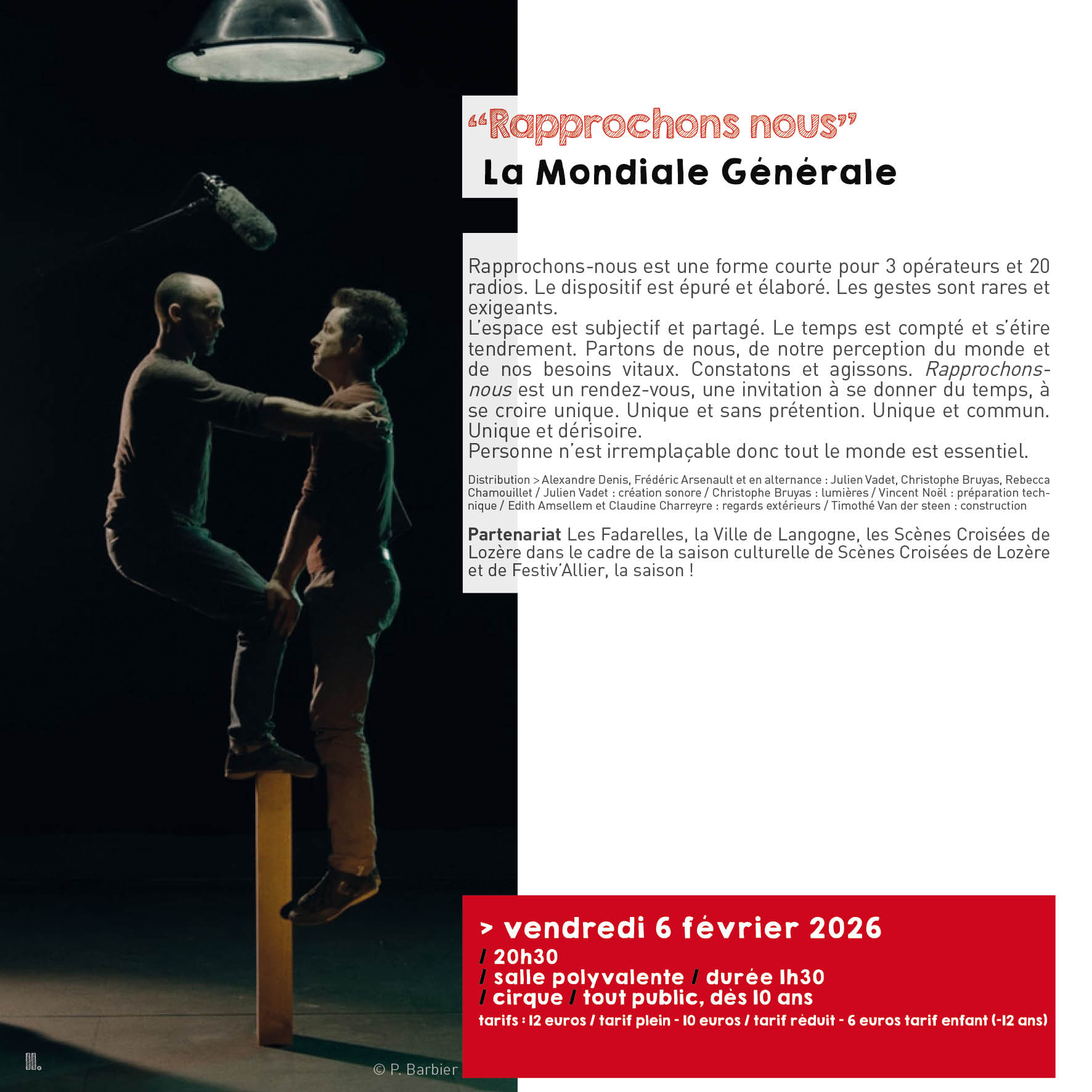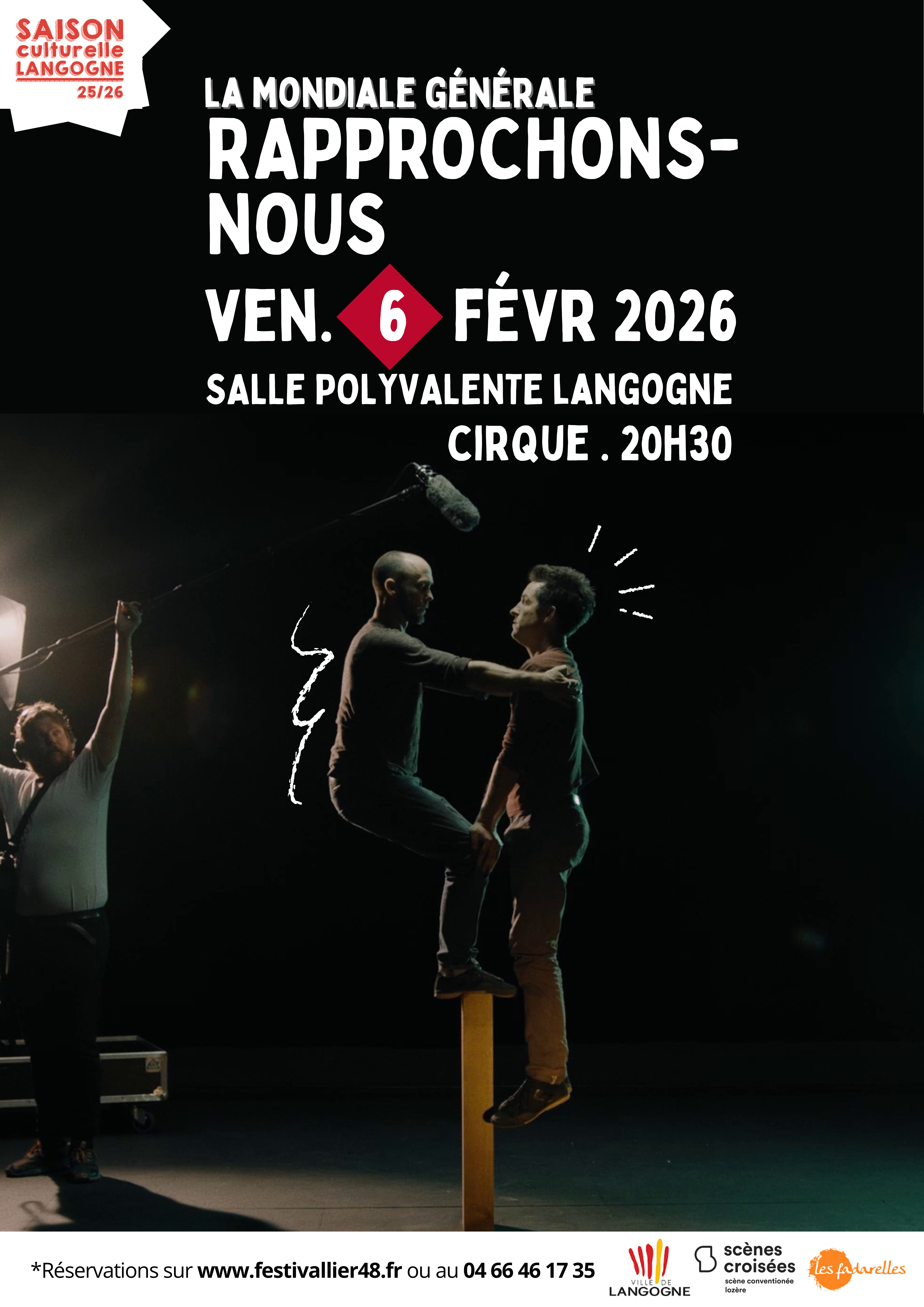 À l'afficheLe 10/02/2026 à 20h30Espace des anges - Rue du Pont Notre Dame - 48000 MENDELe 10/02/2026 à 20h30Théâtre O(l)tto Ladusch - BAGNOLS-LES-BAINS - 48190 MONT LOZERE ET GOULETLe 14/02/2026 à 20h30Foyer rural de Langlade-Brenoux - Foyer rural de Langlade-Brenoux - 48000 BRENOUX